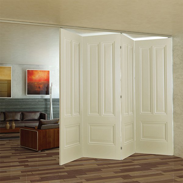 - высокую компактность. Принцип, по которому работает межкомнатная система, заключается в складывании и одновременном сдвижении полотна к одной из стоек коробки. Чтобы реализовать его, производители обращаются к створкам, состоящим из нескольких сегментов. Белые складные двери-книжка содержат в составе два таких элемента, а в устройстве гармошки их может быть 5-7. Открывающееся полотно занимает значительно меньше места напротив проёма, нежели распашной вариант, и выгодно отличается от раздвижной модели тем, что не выходит на стену.