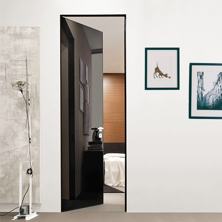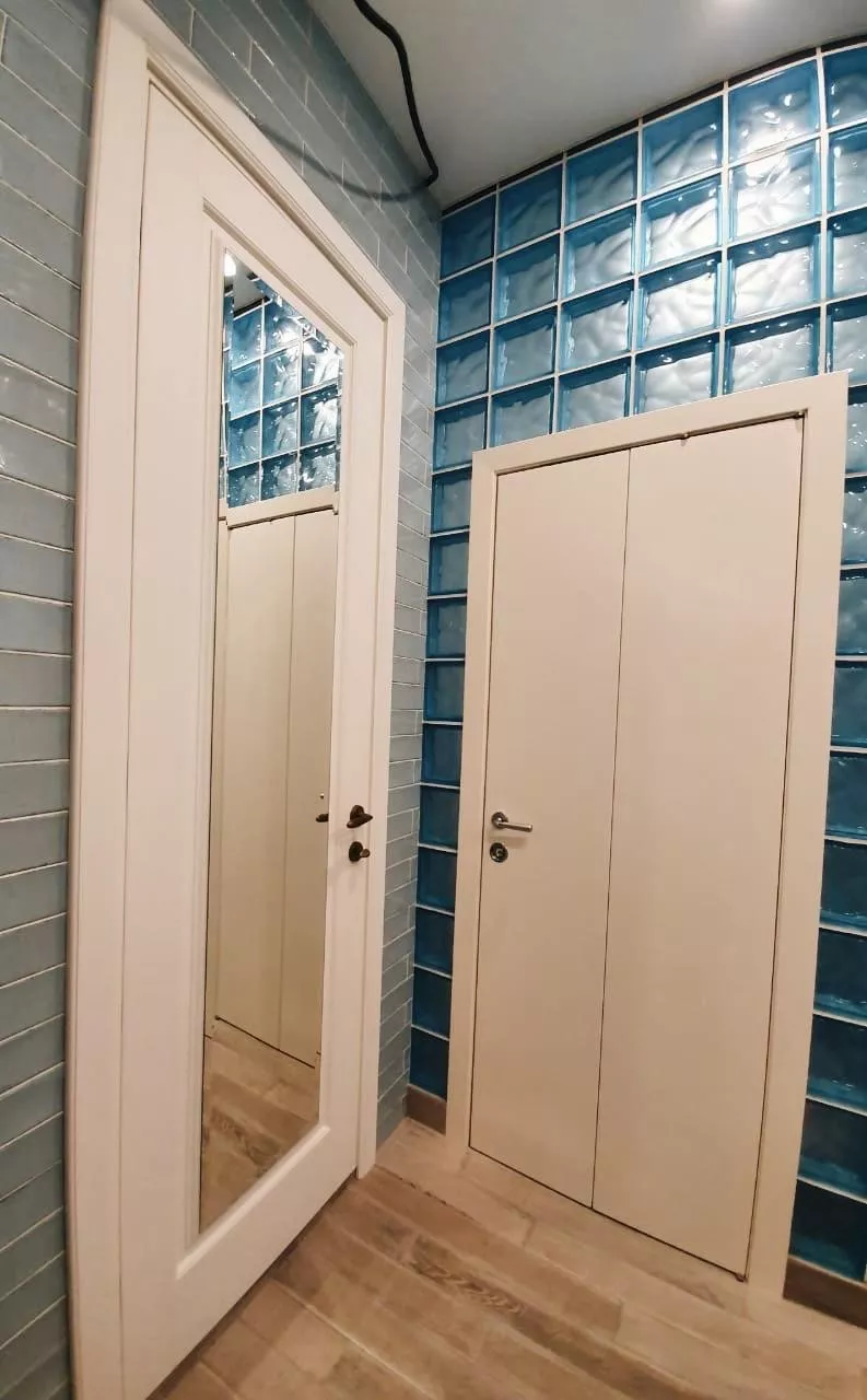 - Двери со вставками: Стеклянные или зеркальные вставки добавляют легкость и визуально расширяют пространство. Возможно сделать вставку из другого материала или цвета, алюминиевого молдинга в аннодировке или окрашивании, композита или керамогранита.