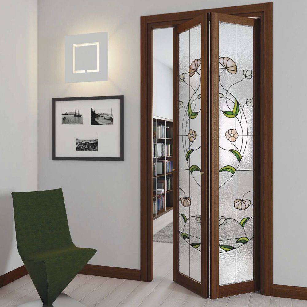 • выбирая подходящие двери-книжка со стеклом для гардеробных и кладовок, хозяева останавливаются на вариантах, которые скрывают обзор. Добиться непрозрачности продукции помогают различные техники обработки - матирование, окрашивание, фотопечать. Примечательной деталью интерьера станет решение, дополненное изысканным витражом или ручной росписью;