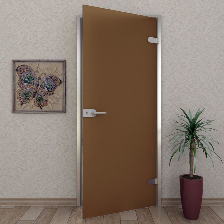 Солнечным сиянием делится с интерьером дверь цвета матовой бронзы. Она великолепно вписывается в уютные домашние обстановки и является одним из самых популярных вариантов оформления бань и саун. Стекло благородного светло-коричневого оттенка, пропуская свет, окрашивает его в жизнерадостные золотистые тона, чем способствует согреванию пространства. Однако для взглядов оно остаётся непроницаемым. Дымка на поверхности полотна, полученная в результате механического или химического матирования, позволяет разглядеть лишь тени и размытые силуэты.