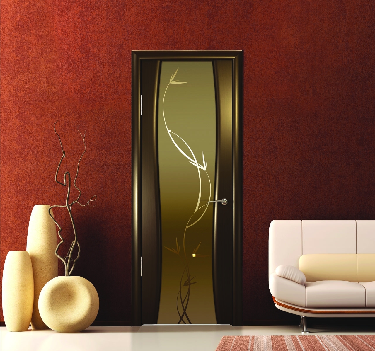 Изысканно и необычно смотрится дверь с матовым стеклом под бронзу, поверхность которой украшена узорами. Получают их самыми разными способами. Один из наиболее популярных: создание матовых изображений на глянцевом изделии или наоборот. Используются и такие методики, как: