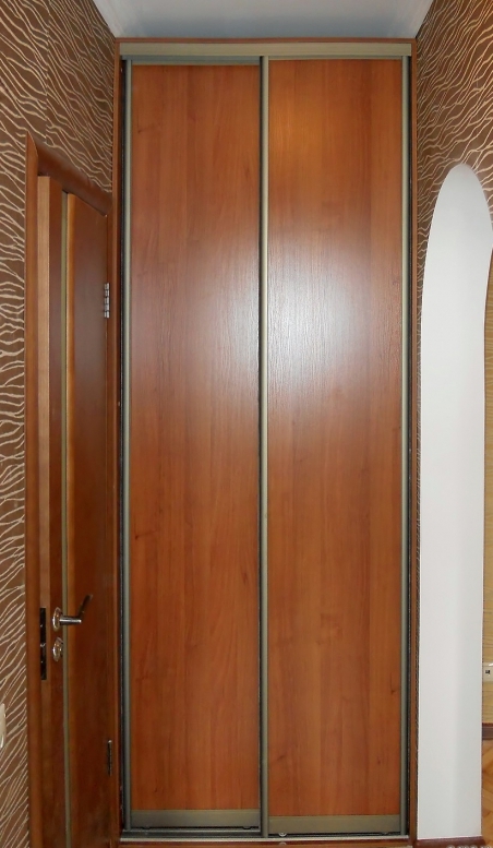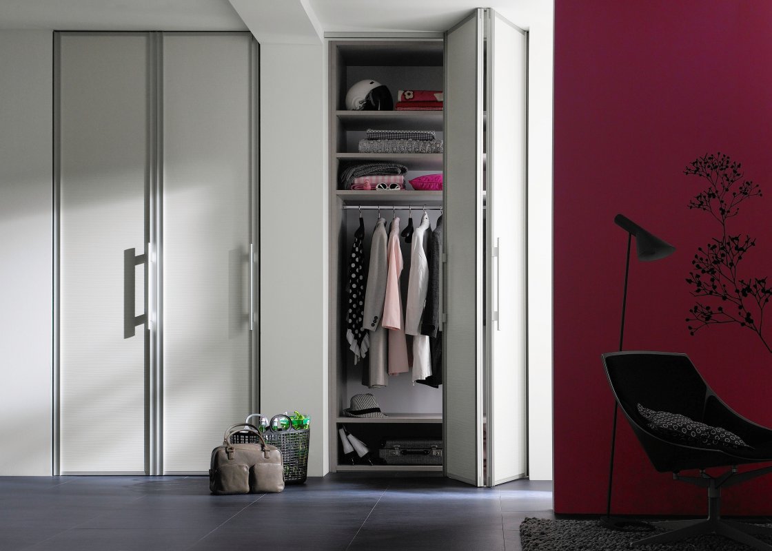 Если нет необходимости экономить площадь, удобным и недорогим решением станет обычная распашная модель. В зависимости от размеров углубления она может быть одинарной или двойной, с равными или неравными по ширине полотнами. Вместо второй рабочей створки нередко используют боковую стационарную секцию. Если же участок для хранения различных предметов быта расположен в тесной прихожей или кухне, есть смысл обратиться: