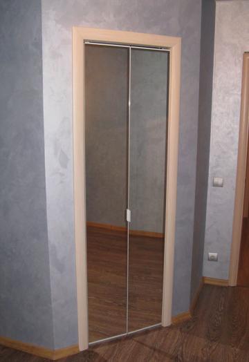 - к купейным вариантам. Купить узкую дверь-купе в нишу производители предлагают в наборе с направляющей, которая монтируется над проёмом, и роликами. Это достаточно простое, но стильное и эффективное инженерное решение;