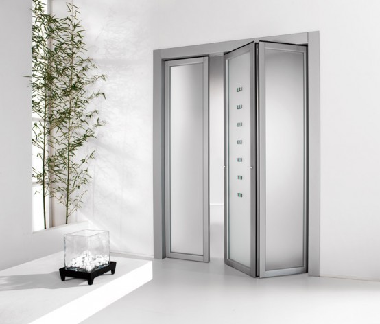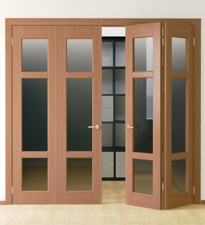 • различным количеством складывающихся секций в устройстве. На основе подобных систем производят не только интересные варианты перекрытия межкомнатных проёмов, но и перегородки для разделения пространства. Так, реально купить двери-книжки на заказ по своим размерам для обособления участка гардеробной, зонирования санузла, обустройства столовой;
