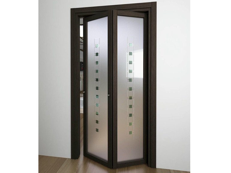 - из интересных материалов. В интернет-магазине можно купить двери-книжки, изготовленные не только из дерева. Большой популярностью пользуются зеркальные, стеклянные, алюминиевые модели. В оформлении двухкомпонентных створок задействуются ценные сорта шпона, эмали, ламинат;