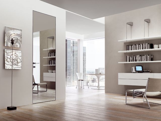 Потайная система сочетается с различными отделками. Оснащению специальной коробкой и петлями подлежат обычные модели из классических и современных коллекций, облицованные шпоном, окрашенные эмалью, остеклённые, глянцевые и т. д. Но эффекта полного слияния со стеной позволяют добиться варианты без готового покрытия.