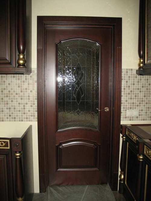 • со стеклом и без. Глухое полотно двери из натурального дубового шпона есть смысл купить для комнаты, в которой требуется создать камерную атмосферу. А остеклённые конструкции традиционно выбирают для гостиных, столовых, кухонь;