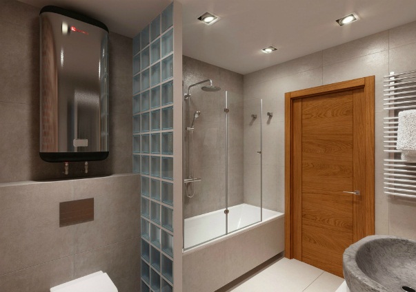 - Отличный вариант для «аквазоны» - стеклянная створка. Матовое, крашеное, декорированное непрозрачной плёнкой изделие создаст визуальную завесу и окажет сопротивление влаге. Светопрозрачная модель и гигиенична, и экологична, и стабильна.