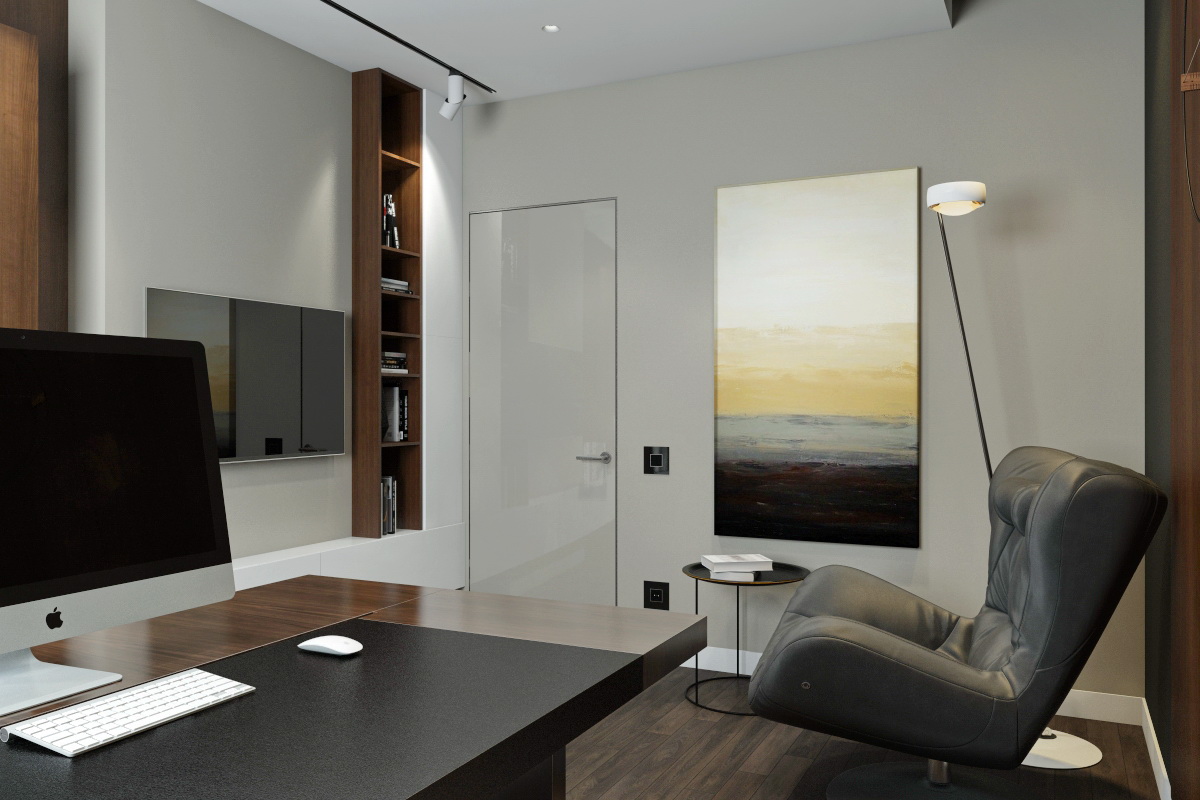 Поддержать рабочую обстановку в помещении способны серые гладкие офисные двери. Цвет бетона и металла воспринимается как фоновый, не раздражает, не беспокоит, сочетается с оргтехникой. Впрочем, ничто не помешает несколько разнообразить сдержанное офисное пространство, дополнив его более яркими вкраплениями. Например, чёрная или красная створка в современной минималистской композиции может смотреться весьма выгодно.