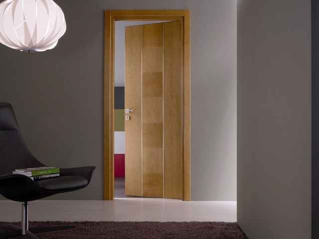 • механическую безопасность. От остеклённых конструкций нередко отказываются родители маленьких детей. Глухие гладкие двери из шпона дуба не станут причиной серьёзной травмы у ребёнка, например, въехавшего в них на трёхколёсном велосипеде. С другой стороны, современные производители уделяют немало внимания и безопасности стекла, предлагая вставки, не создающие острых осколков при разрушении.