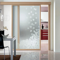 • совершенно прозрачны, матированы пескоструйным или химическим методом, оклеены декоративными плёнками, частично или полностью ограничивающими обзор;