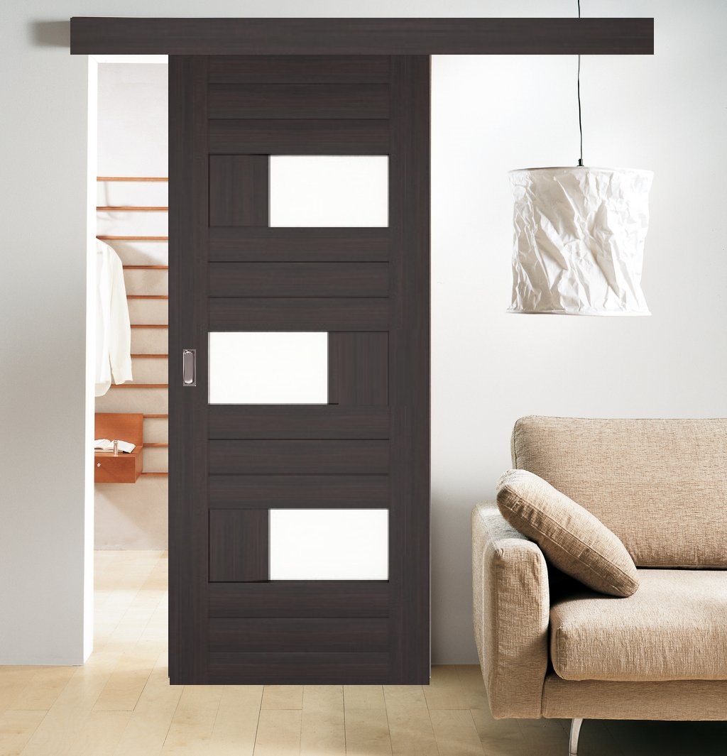 - простоту монтажа, если сравнивать с другими конструкциями раздвижного открывания. Модель представляет собой сочетание полотна и рельса, который закрепляется в стене или потолке над проёмом. Никаких дополнительных работ по переоборудованию стены не требуется - система становится в самый обычный проход, а точнее, накладывается на него;
