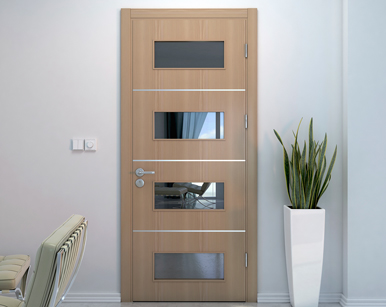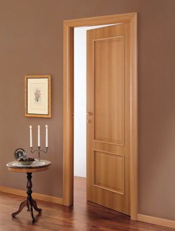 - из тонкого древесного среза, аккуратно покрывающего все элементы полотна. Зачастую недорогие межкомнатные двери из шпона оформляют по технологии файн-лайн, что на порядок уменьшает их цену. Такая облицовка изготавливается путём обработки и окрашивания из малоценных мягких пород. Данная методика делает доступными модели экзотических расцветок - красное дерево, эбен, палисандр, мербау. В натуральной отделке они по стоимости превосходят средние показатели.