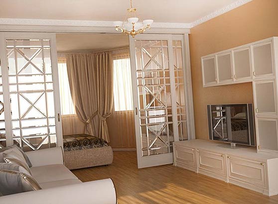 - разделить территорию, но не глухими стенами, а лёгкими и мобильными перегородками, которые исчезают по желанию владельца. Сдвижные модели активно используются в сегментировании просторных гостиных, участвуют в создании столовых и гардеробных, устанавливаются при выходе на террасы и т. д.;