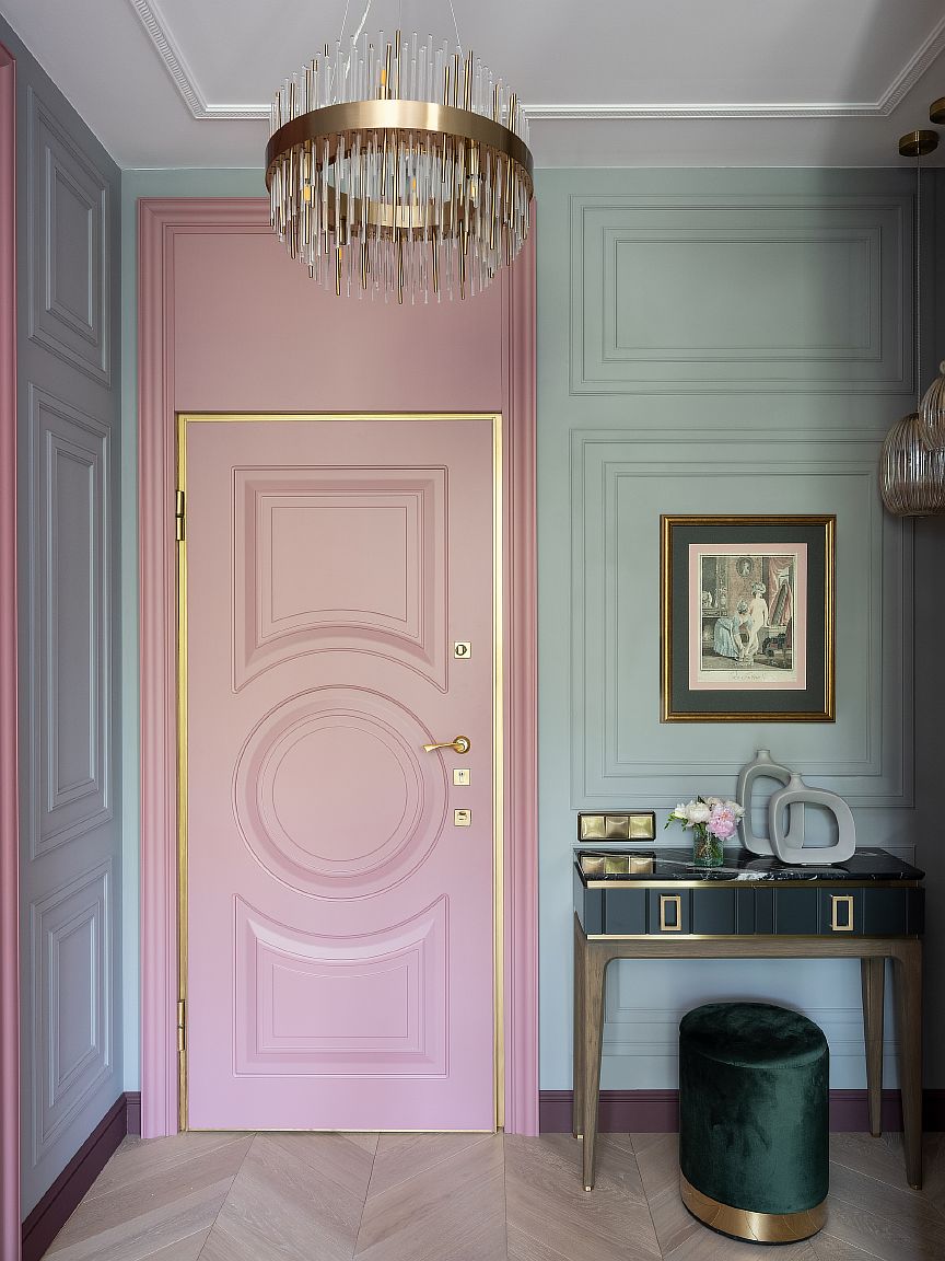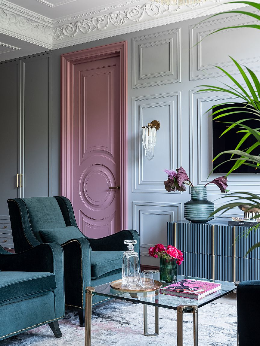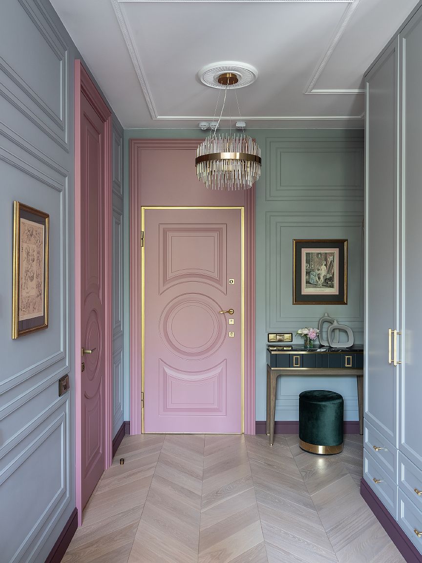 Стиль интерьера определили, как современную классику. Основные цвета — стальной серый, пудровый розовый, изумрудно-зеленый и оттенок латуни. Двери высокие — почти 3 метра. Высокие потолки и панорамное остекление позволили впустить в интерьер «воздух», благодаря чему смелое цветовое решение только выиграло — благородные оттенки полностью раскрылись.