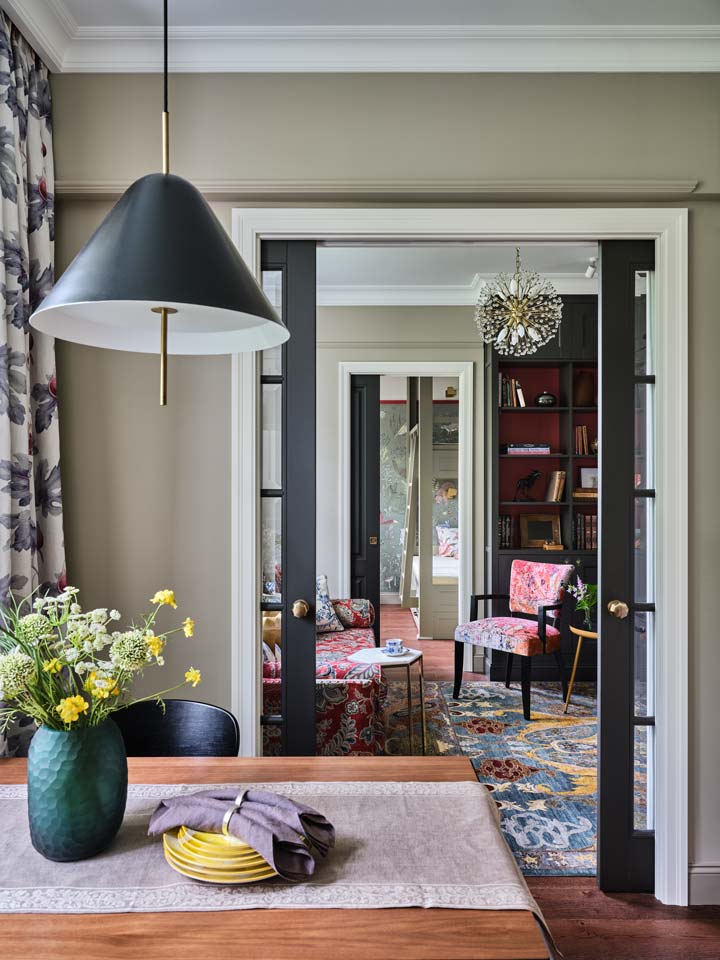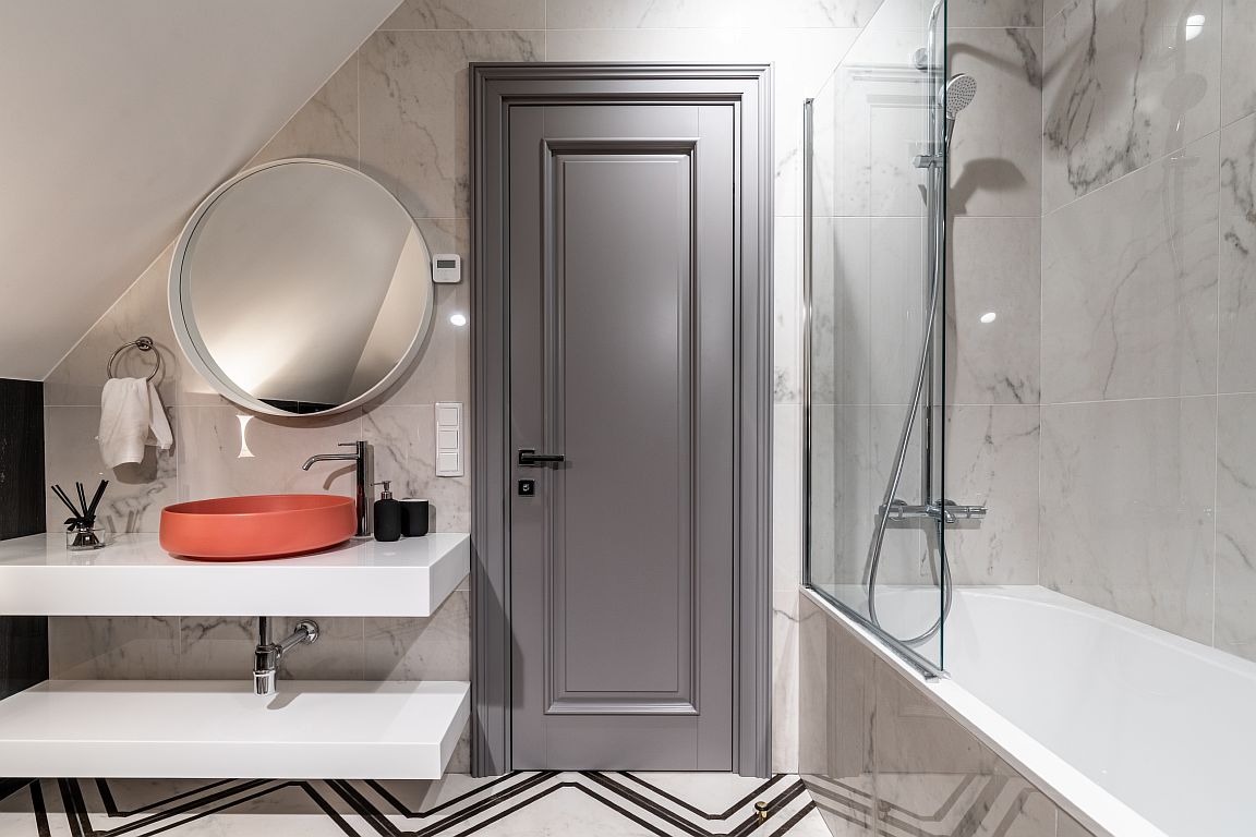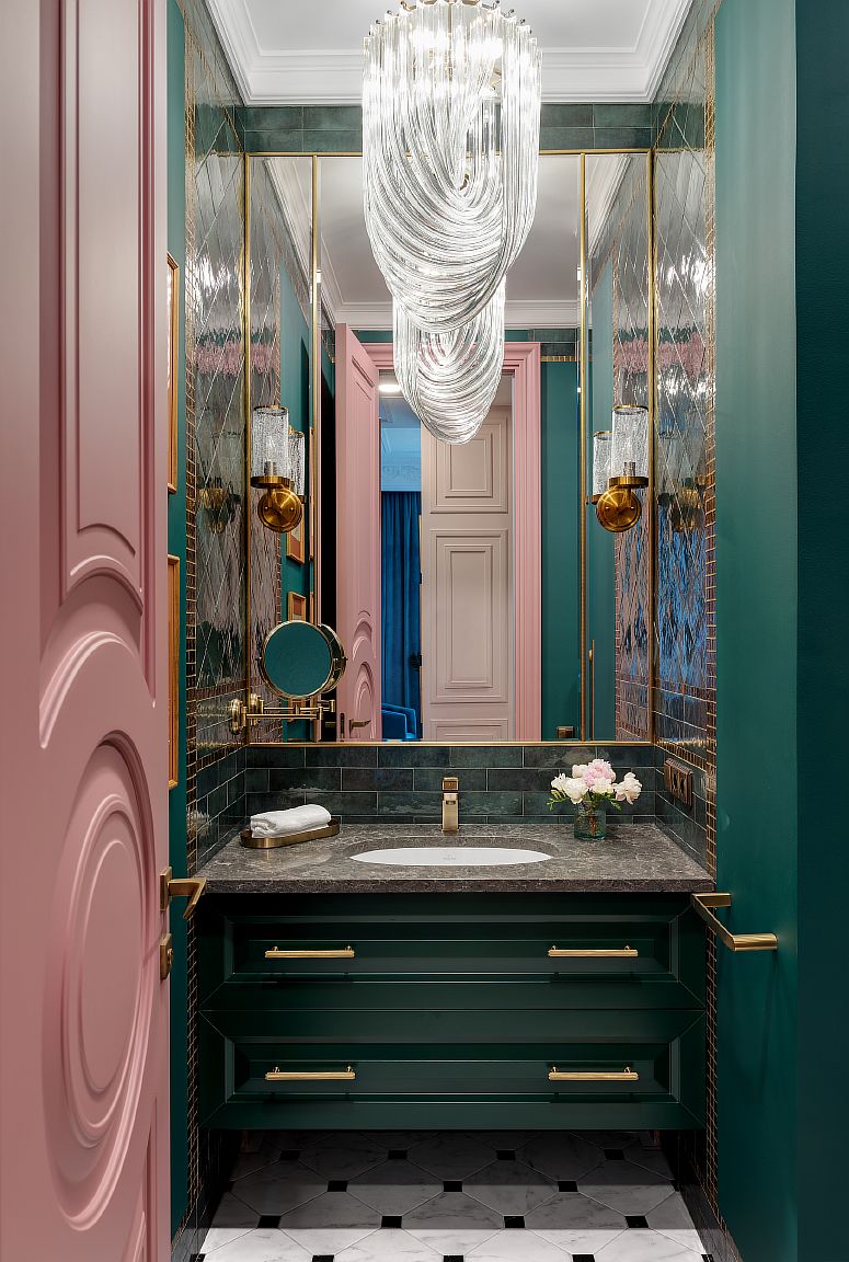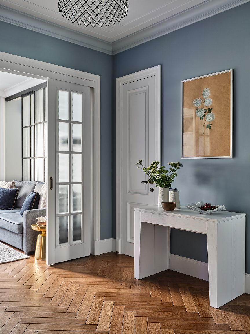 Стиль интерьера определили, как современную классику. Основные цвета — стальной серый, пудровый розовый, изумрудно-зеленый и оттенок латуни. Двери высокие — почти 3 метра. Высокие потолки и панорамное остекление позволили впустить в интерьер «воздух», благодаря чему смелое цветовое решение только выиграло — благородные оттенки полностью раскрылись.