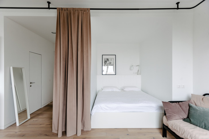 Комната открытой планировки, объединяющая гостиную, кухню, столовую и спальню - кровать спрятана в нише. Общая площадь: 33 м². Скрытая дверь под покраску отлично вписалась в современный интерьер.