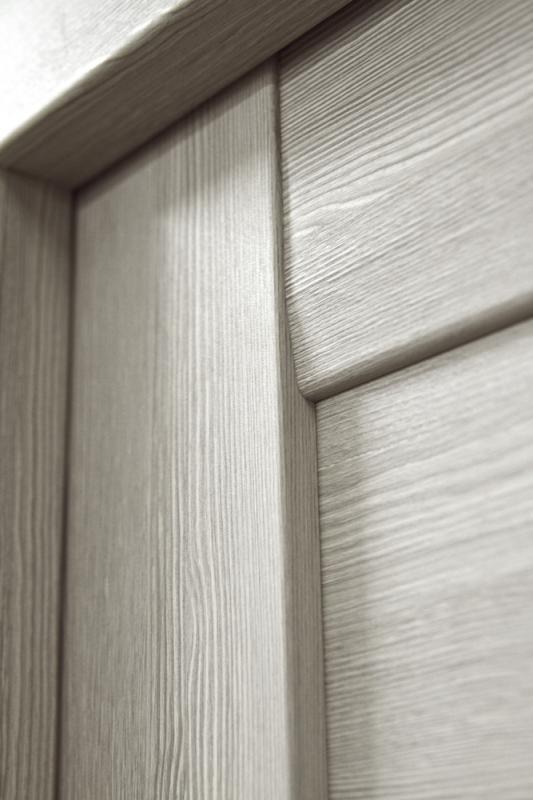 • достойную механическую стойкость. Да, хвойные породы, за исключением лиственницы, относят к мягким материалам. Но для бытового уровня эксплуатации их прочности вполне достаточно. К тому же, шпонированные двери из массива сосны содержат в основе не цельное, а сращённое дерево, которое отлично справляется с нагрузками;