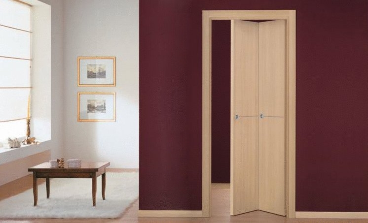 - книжка. Полотно разделено на два сегмента в равных или неравных пропорциях. В открытом виде оно распределяет полученную после складывания ширину между смежными комнатами, таким образом, занимая минимальное пространство в каждой из них. Оснащённая уплотняющими контурами по периметру обеих секций, подобная конструкция отличается неплохими изолирующими способностями;