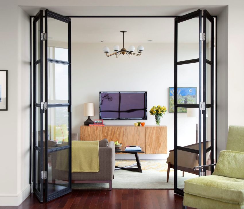 Выбирая, какую конструкцию купить для оформления межкомнатного проёма, рассматривая фото в каталогах и интерьерах, клиенты особо отмечают складывающиеся двери. Решения, которые являют собой одну из разновидностей откатных систем, идеальны на небольших участках пространства. Они без труда закрывают даже те проходы, которые из-за дефицита площади недоступны ни купейным, ни встроенным моделям. Изящную створку можно интегрировать в узкий коридор, неудобно расположенную нишу, тесную кухню, окружённую громоздкой мебелью гардеробную. Она занимает минимум места и эффективно разгружает обстановку.