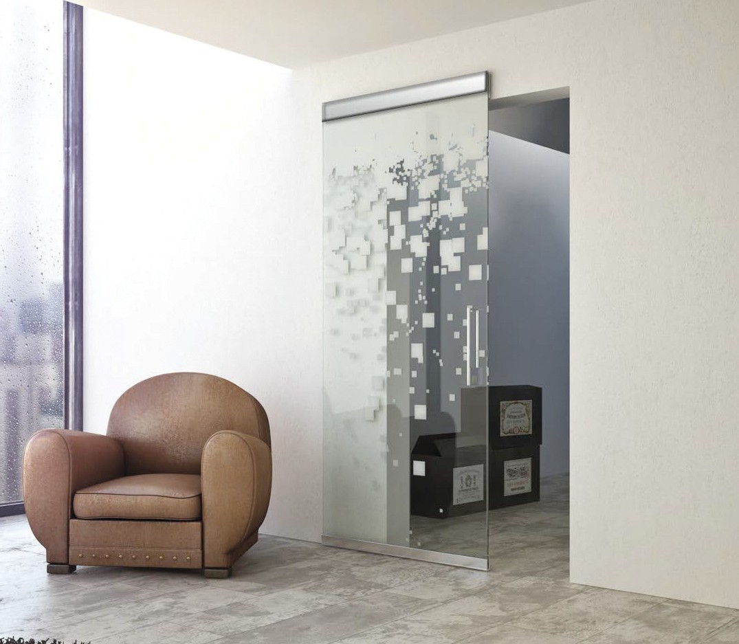 - конструкция, встроенная в стену. Все её рабочие элементы полностью исчезают из поля зрения - на виду только полотно, но и оно в открытом виде прячется в специальной парковке. Установку скрытой двери со стеклом такого типа делает возможным металлический пенал. Его монтируют в стену на ранних этапах ремонта. Изделие отличается высочайшей компактностью и подходит для эксплуатации в самых маленьких и тесных комнатах. В данном исполнении может быть представлена как современная, так и классическая модель.