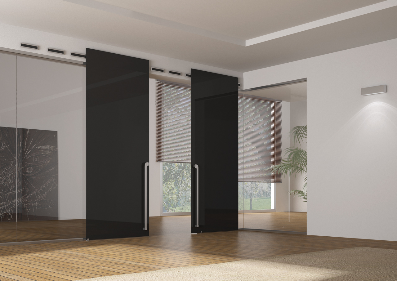 - раздвижная скрытая дверь со стеклом, механизм которой спрятан за декоративной планкой. В подобном исполнении нередко выпускаются купейные системы. Створка скользит плавно и бесшумно, создавая впечатление парения над полом;