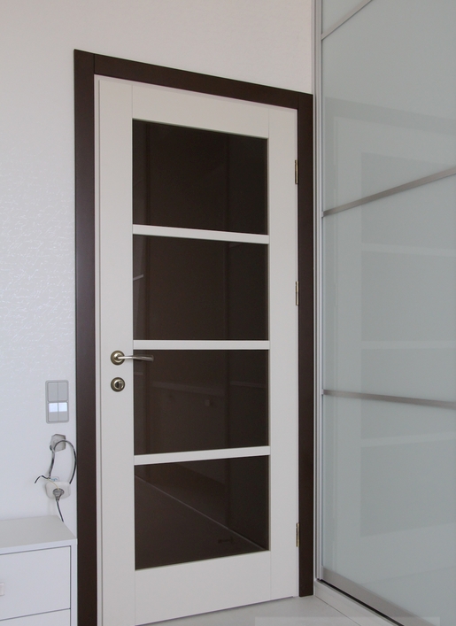 Придать конструкции ещё больше яркости и незаурядности во всех случаях позволяют декоративные элементы насыщенных расцветок. Традиционные модели дополняют филёнками, контрастирующими с общей поверхностью, тёмными багетами, художественной росписью. Светлую дверь с тёмными наличниками современного стиля нередко можно купить в комплекте с чёрными стеклянными вставками.