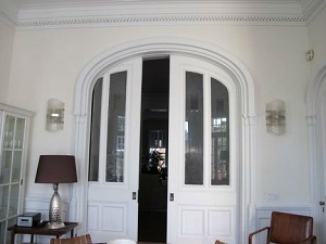 две створки. Данный вид филёнчатых дверей активно используется в дизайне гостиных загородных домов, торжественных залов. Двухстворчатую модель устанавливают в проём шириной 1200-1900 мм. В её составе находятся равноразмерные или асимметричные секции;